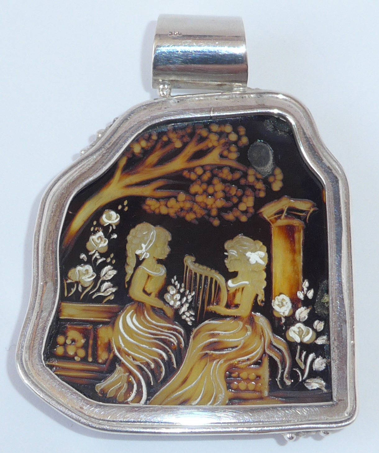 Bernstein Gemme (Kamee) Anhänger, Märchenwelt.Ein kleines Kunstwerk. Gestochen scharf graviert. Individuell & edel. Diese wunderschöne Bernstein Gemme vereint kunstvolle Handwerkskunst mit der natürlichen Schönheit des fossilen Harzes. In feinster Gravurtechnik zeigt sich auf der Oberfläche des Bernsteins eine filigrane Szene. Zwei Frauen in anmutiger Haltung, eine davon spielt ein Harfe, ein Sinnbild für Musik, Harmonie und innere Ruhe. Umrahmt wird das Motiv von einem stilisierten Baum, zarten Blumenblüten sowie einer klassischen Säule, die dem Bild eine fast antike, zeitlose Eleganz verleiht. Ein faszinierendes Schmuckstück für Liebhaber klassischer Symbolik, historischer Motive und feinster Handwerkskunst. Ber Bernstein wurde in 925er Silber gefasst, Maße/ Bernstein (ohne Öse): 5,80 cm x 5,20 cm x 0,80 cm. Gewicht: 40,60 Gramm. |