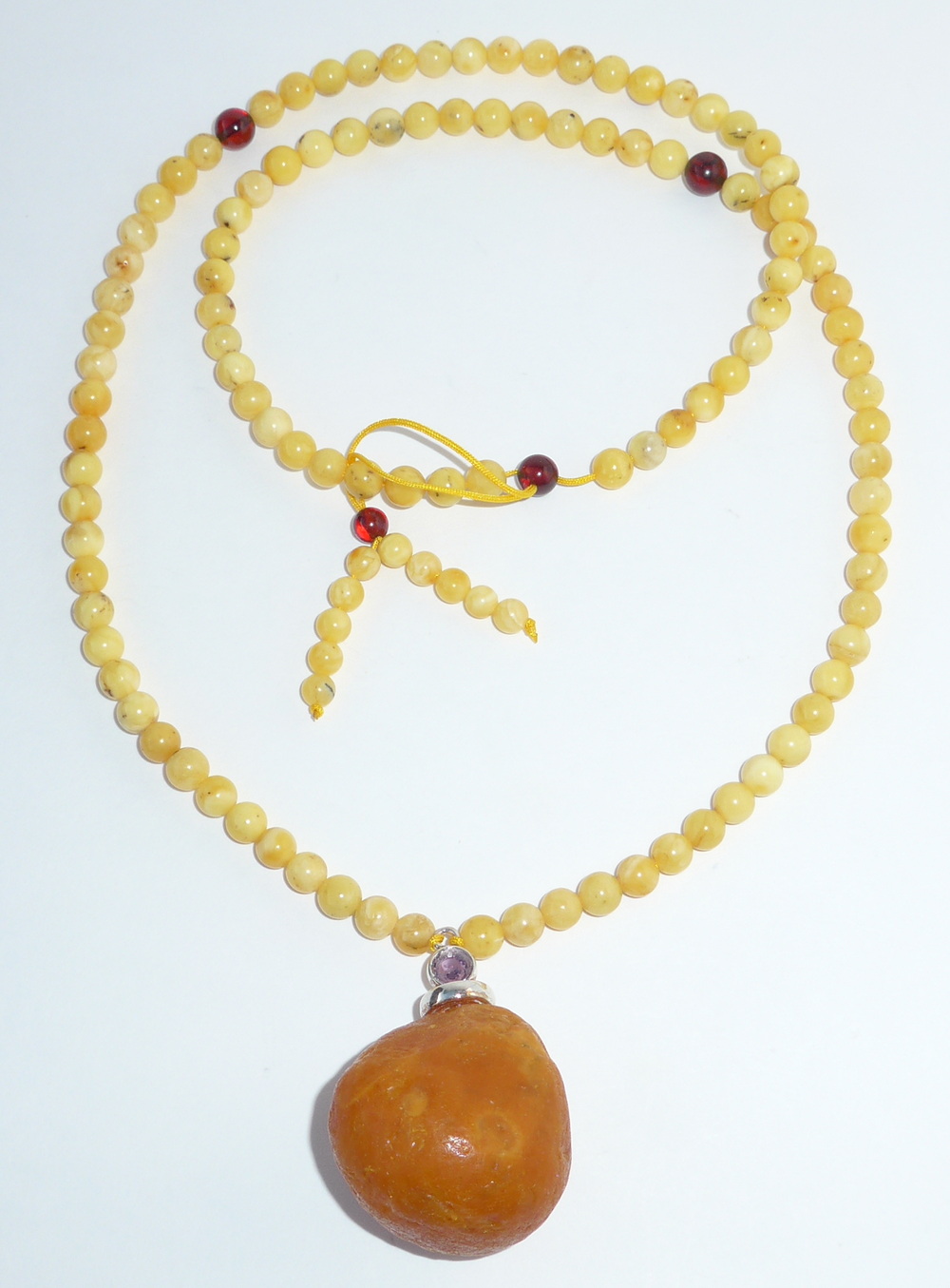 Maße/ Bernstein (ohne Öse): 3,10 cm x 2,90 cm x 2,80 cm. Gewicht: 28,40 Gramm. Variable Länge der Halskette: von 60 cm bis 70 cm. Durchmesser/ Bernstein Perlen: 0,55 cm. |