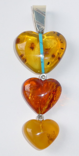 Ausgefallener, mehrfarbiger Bernstein Herzen Anhänger. Individuell & extravagant schön. Sehr schöne Farbzusammenstellung. Kreatives Design. In dem großen Herz wurde ein echter Türkis eingearbeitet, was bei der Seitenansicht ein schönes Farbenspiel auslöst. Die Bernsteine wurden geschliffen und poliert. 925er Silber. Maße (ohne Öse): 9,50 cm x 4,00 cm x 1,60 cm. Gewicht: 29,90 Gramm. Weitere Details, bitte hier ! |