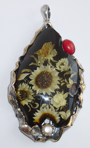 Bernstein Gemme (Kamee), Sonnenblumen. Ein kleines Kunstwerk. Gestochen scharf graviert. Individuell & edel. Dunkel farbener Bernstein, in 925er Silber gefasst (an den Rändern leicht vergoldet). Auf der Rückseite des Bernsteins wurden in Handarbeit, aufwendig, Sonnenblumen, eine Rose und eine Fee eingraviert. Verarbeitet mit einer Zuchtperle und roter Koralle. Maße/ Bernstein (ohne Öse): 9,70 cm x 6,00 cm x 1,50 cm. Gewicht: 81,60 Gramm. Weitere Details, bitte hier ! |