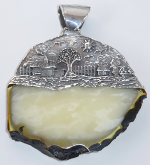 Großer, mystischer Bernstein Anhänger. Ein Bernstein Anhänger mit detailreicher Silberschmiedekunst. Von einem großen, grünlichen Bernsteinstück wurde eine Scheibe abgeschnitten und raffiniert mit 925er Silber verarbeitet. Die Bernsteinscheibe wurde geschliffen und poliert. Maße (ohne Öse): 8,70 cm x 7,60 cm x 1,20 cm. Gewicht: 90,40 Gramm. Weitere Details, bitte hier !