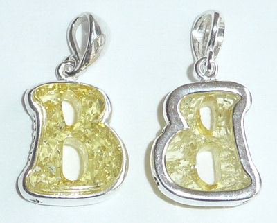 Bernstein Buchstaben Anhänger. B. Gelblich farbener Bernstein, geschliffen und poliert. 925er Silber. Maße (ohne Öse): 1,4 cm x 1,2 cm x 0,4 cm. |