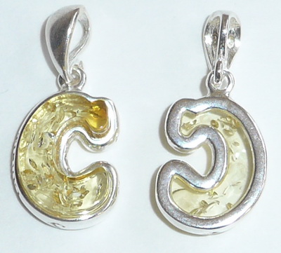 Bernstein Buchstaben Anhänger. C. Gelblich farbener Bernstein, geschliffen und poliert. 925er Silber. Maße (ohne Öse): 1,4 cm x 1,0 cm x 0,4 cm. |