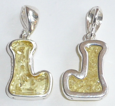 Bernstein Buchstaben Anhänger. L. Grünlich farbener Bernstein, geschliffen und poliert. 925er Silber. Maße (ohne Öse): 1,4 cm x 1,1 cm x 0,4 cm. |