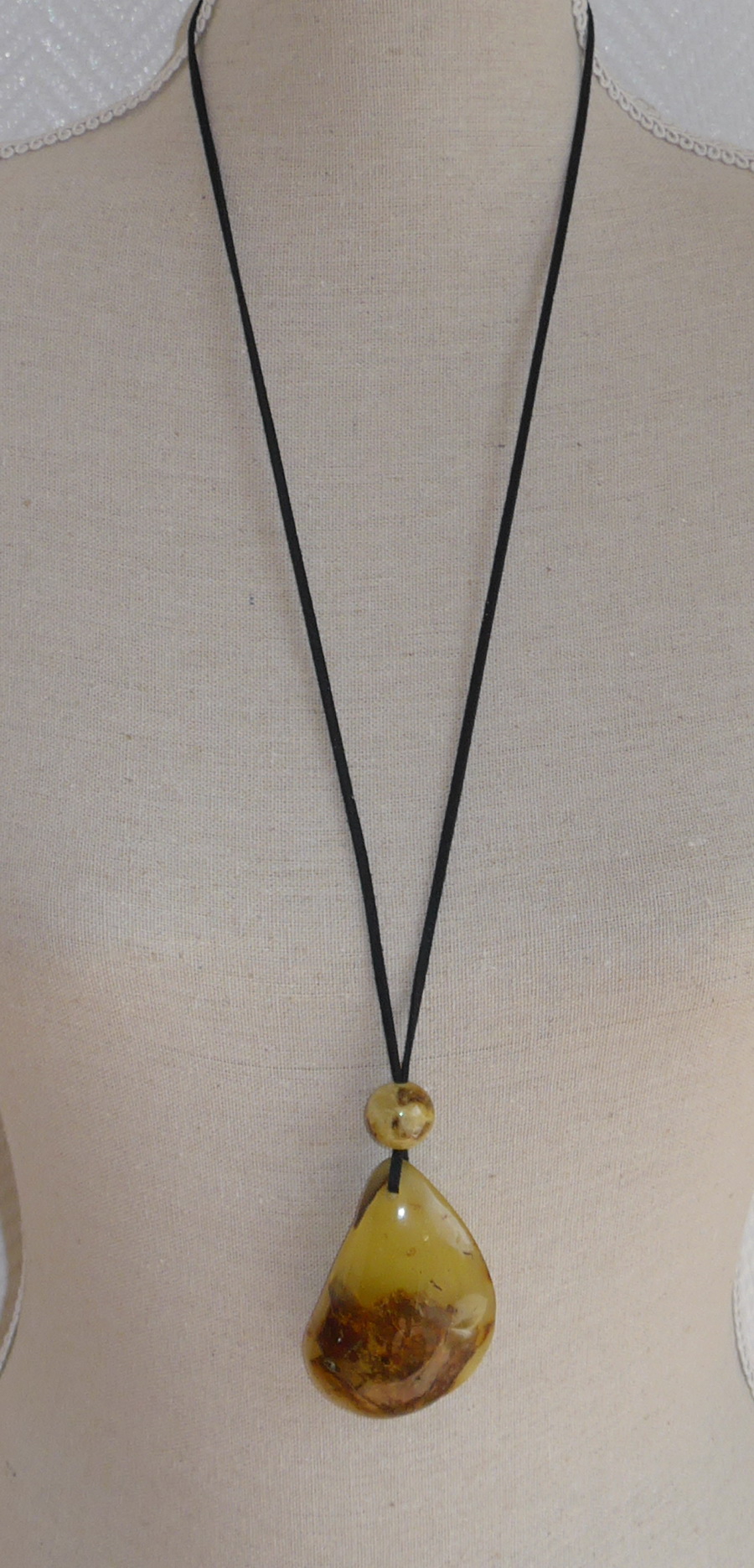 Naturbernstein Anhänger am Stoffband.Dieser Anhänger aus gelblich, milchigem Bernstein strahlt eine weiche, sanfte Wärme aus. Die leicht opake Struktur verleiht dem Bernstein eine seidige, fast samte Ausstrahlung und macht ihn zu einem besonders ruhigen, harmonischen Begleiter. Ergänzt wird das Schmuckstück durch eine passende Bernsteinperle, beide getragen an einem schlichten Stoffband, das die Natürlichkeit des Designs unterstreicht. Ein stilles, ursprüngliches Accessoire mit weicher Ausstrahlung und zeitloser Natürlichkeit. Maße/ Bernstein: 6,90 cm x 4,30 cm x 2,30 cm. Durchmesser/ Bernstein Perle: 1,65 cm. Gewicht: 36,30 Gramm. Länge/ Stoffband: 80 cm. |