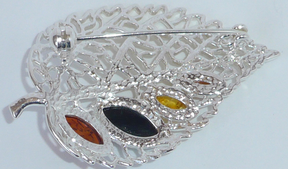 Mehrfarbige, elegante Bernstein Brosche, Blatt.Maße: 4,40 cm x 2,70 cm x 0,80 cm. 925er Silber. Gewicht: 6,30 g. |